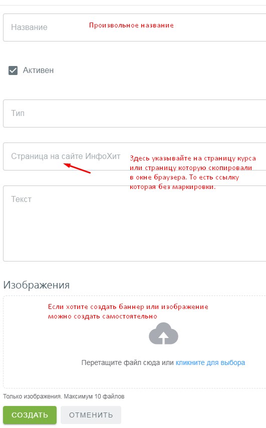 Если у партнёрки нет маркированных ссылок, то переходите на страницу выбранного курса в самом сервисе Info-hit. Копируйте в окне браузера ссылку и в разделе *Партнёрские креативы* создаёте новый креатив.