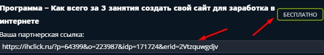 Получаете партнерскую маркированную ссылку на выбранный курс. При создании креатива прочитайте подробную инструкцию. Иногда на страницах курсов или партнёрок в левом нижнем углу может может тоже появиться партнерская или маркированная ссылка.