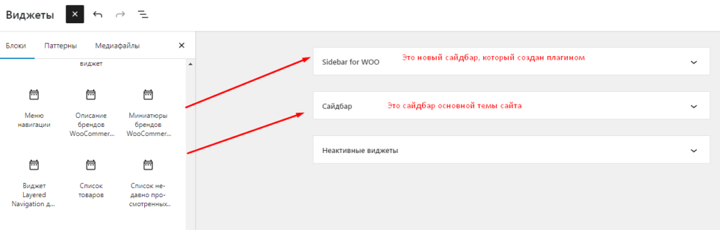 Переходим в консоли WP в настройки виджетов. Новая панель Sidebar for WOO — это создано с помощью плагина. А Сайдбар — это боковая панель основной темы (шаблона сайта).