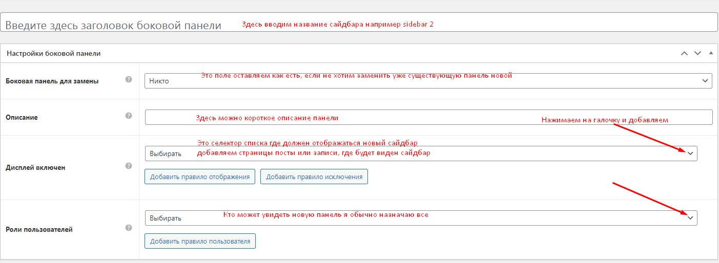 Создаём новую боковую панель. В селекторе *Дисплей включён* выбираем и добавляем все страницы вашего сайта, где хотите вывод показа созданного сайдбара. Если хотите полностью убрать или заменить существующие панели новой, то через галочку укажите какую хотите заменить. Если не хотите этого делать, а просто добавить другую панель, то в первом пункте ничего не меняйте. После заполнения таблицы настройки сохраняем и публикуем. Теперь нужно установить нужные вам виджеты на только созданную панель и проверить её отображение на страницах сайта.