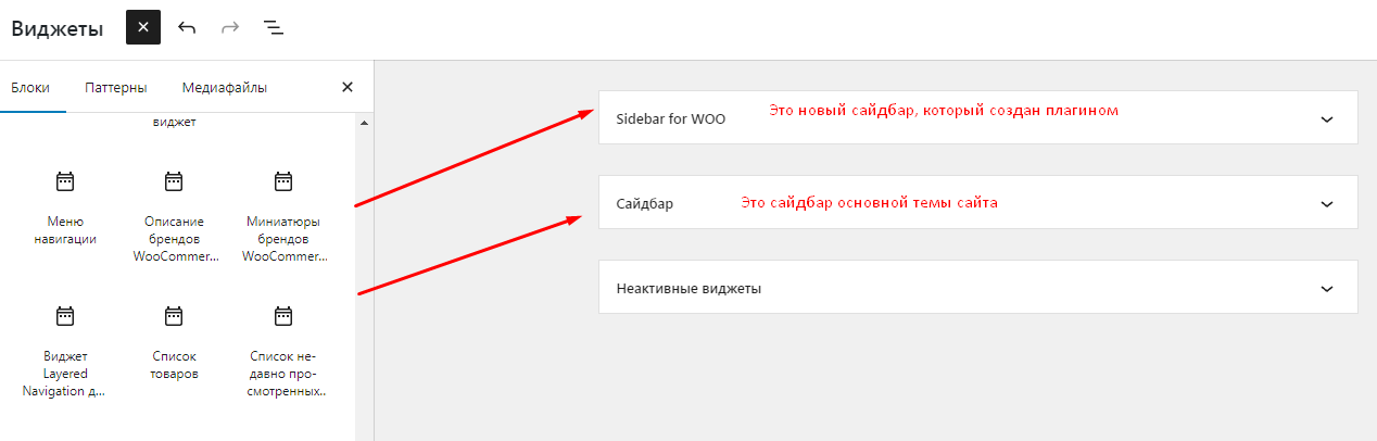 Переходим в консоли WP в настройки виджетов. Новая панель Sidebar for WOO — это создано с помощью плагина. А Сайдбар — это боковая панель основной темы (шаблона сайта).