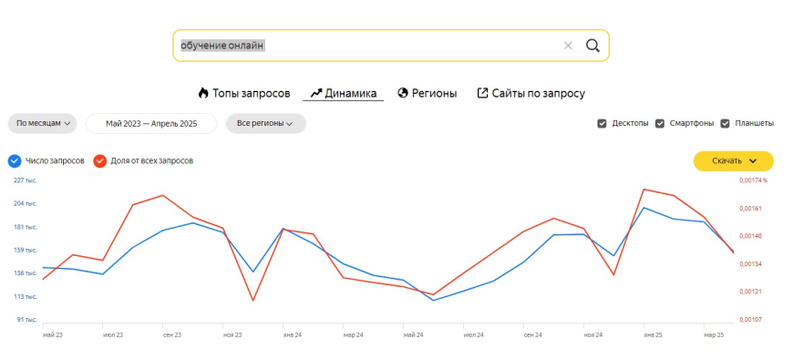 Видим, что динамика запросов по этой тематике к лету немножко спадает, но всё равно количество запросов очень высокое. Можно заниматься партнерским маркетингом по этой тематике.Только запросы нужно делать более узкими из-за высокой конкуренции. Например вводить значение *Обучение онлайн с нуля бесплатно* или *курсы онлайн обучения дизайну интерьеров*. Не берите в работу высокочастотные запросы, по ним сайтов-конкурентов будет много. Для начала используйте запросы с частотой от 5-10 до 500-700.