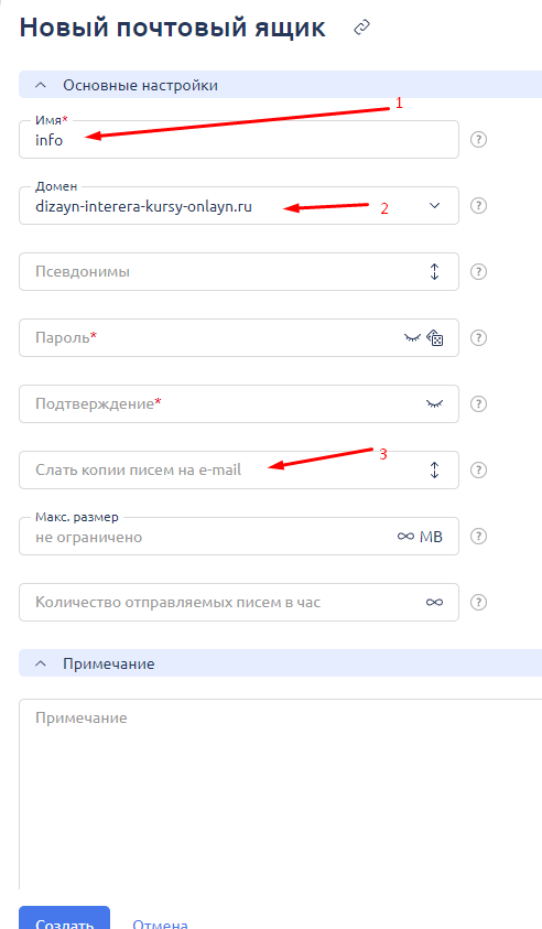 Не забываем скопировать и сохранить в файлике создаваемого сайта пароль и полное название (адрес) почты. Если всё правильно заполнили, то должна получиться почта (почтовый ящик) имя@ваш домен. Жмём *создать* и получаем почтовый ящик (эл. почту).