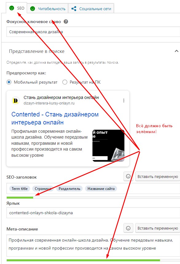 При редактировании переходите на страницу онлайн-школы и смотрите, как она будет выглядеть.Не забывайте и seo анализ — всё должно быть зеленого цвета.