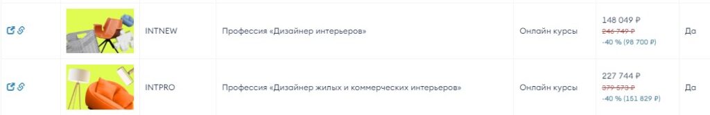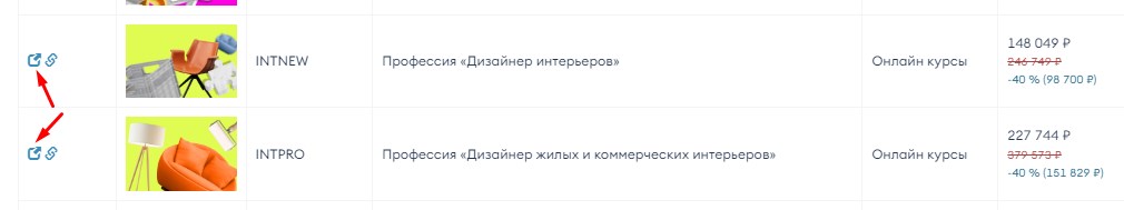 Переходим в раздел *Товарный фид* и ищем курсы в нужной категории по тематике нашего сайта. Сразу нашёл два подходящих онлайн-курса по дизайну интерьеров. Стрелочками показаны ссылки на страницы курсов. Изображение скопируёте себе на комп.