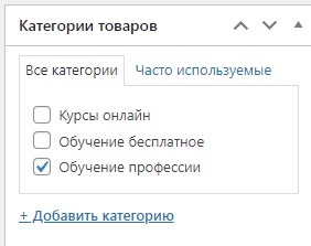 Ставим галочку к какой категории относится наш курс. Курс *Профессия дизайнер интерьера* относится к обучению профессии. Отмечаем данную каегорию. Категории мы создавали в шаге