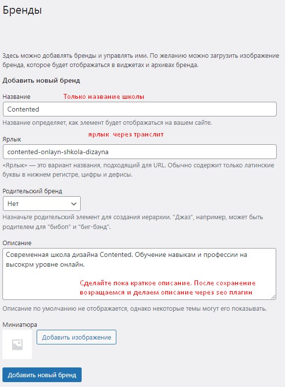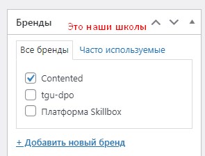 - Делаем описание онлайн-школы, платформы обучения или автора, которые проводят обучение. В консоли wp создаём новые бренды. На нашем сайте бренды будут отображаться как онлайн-школы;