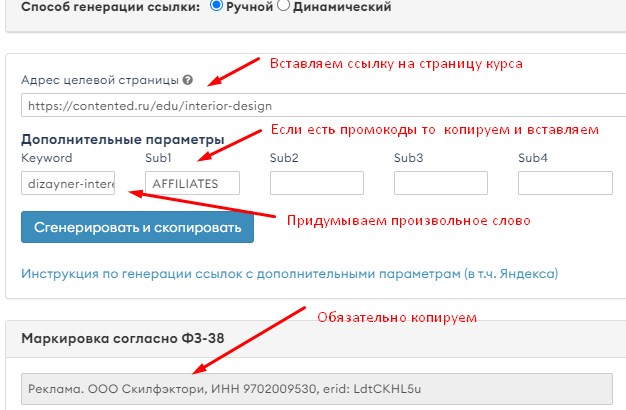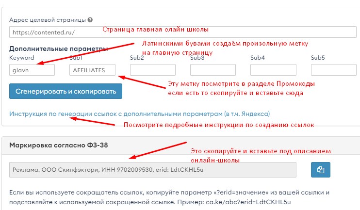 - Формируем партнерские ссылки на онлайн-курсы и онлайн-школы согласно закону о рекламе РФ. Согласно этому же закону, размещаем ссылки и креативы на страницах школ и страницах курсов.