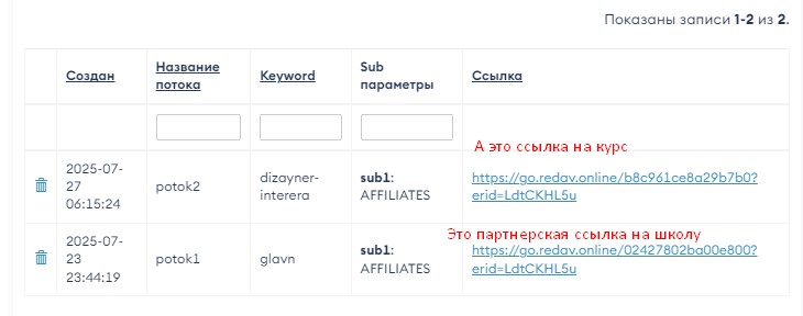Теперь сохраняем название потока ссылок и получаем список партнерских ссылок по этой онлайн — школе. Следующими в этом списке будут сформированные партнерские ссылки уже на курсы от этой школы.
