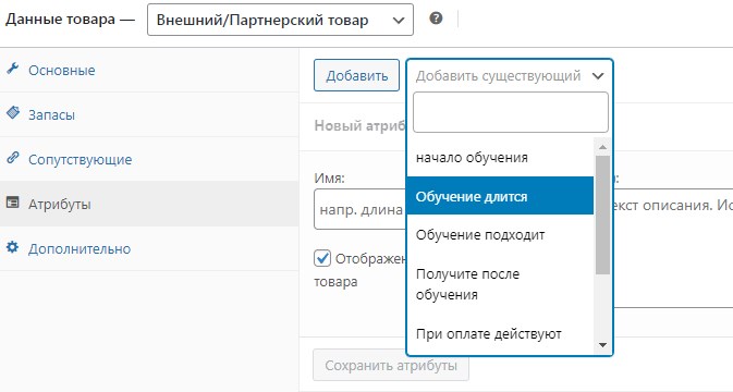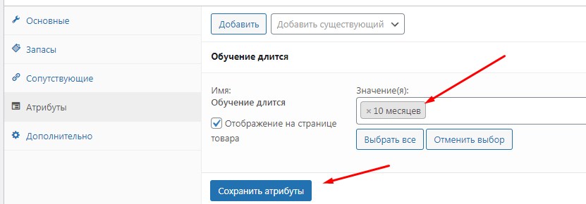 В атрибутах добавляем существующие. Они появятся в табличке автоматически. Для наглядного примера, я выбрал атрибут сколько длится обучение. Нажимаем выбрать значение. Появляется табличка со всеми значениями для этого атрибута. Выбираю 10 мес. и сохраняю. Повторяйте действия по всем атрибутам и их значениям, которые вы создали на сайте. Быстрый способ — выбрать все, а потом убрать лишние значения.