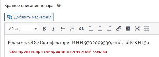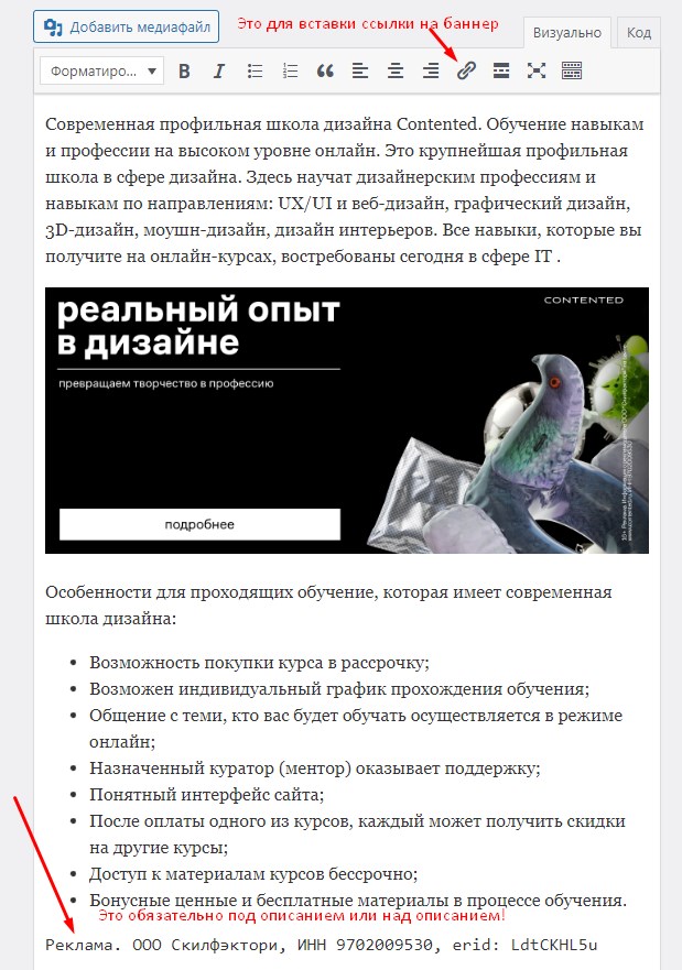 Чуть не забыл, теперь нужно обязательно обозначить рекламные данные. По закону продвигаемые курсы обучения на сайтах являются рекламой. Тут уж никуда не денешься, нужно указывать данные рекламодателя. Данные рекламодателя можно указать на странице описания после обзора курса. А можно на странице редактирования в блоке краткого описания. Вставляем и сохраняем. Под названием курса должна появиться запись.
