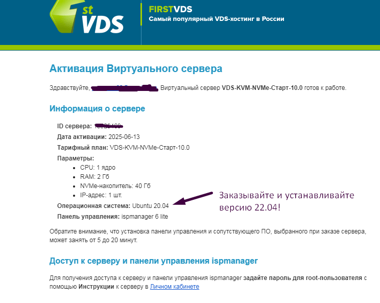 После оплаты на электронную почту приходит письмо об активации виртуального сервера